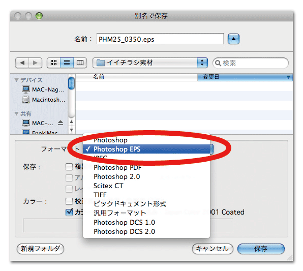 保存は「Photoshop EPS」でおこなってください。メニューバーの「ファイル」>「別名で保存」からフォーマットを「Photoshop EPS」にします。