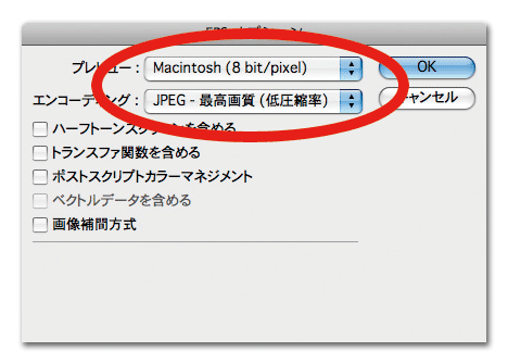 「EPSオプション」のダイアログが出たら、「プレビュー」を「Macintosh(8bit/pixel)」または「エンコーディング」、「8bitTIFF」を「JPEG – 最高画質(低圧縮率)」に設定してください。
